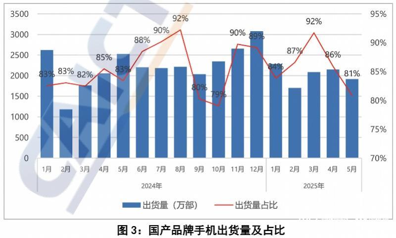 7月4日,中国信通院发布2025年5月国内手机市场运行分析报告显示,报告显示2025年5月,国内市场手机出货量2371.6万部,同比下降21.8%,其中,5G手机2119.0万部,同比下降17.0%,占同期手机出货量的89.3%。
