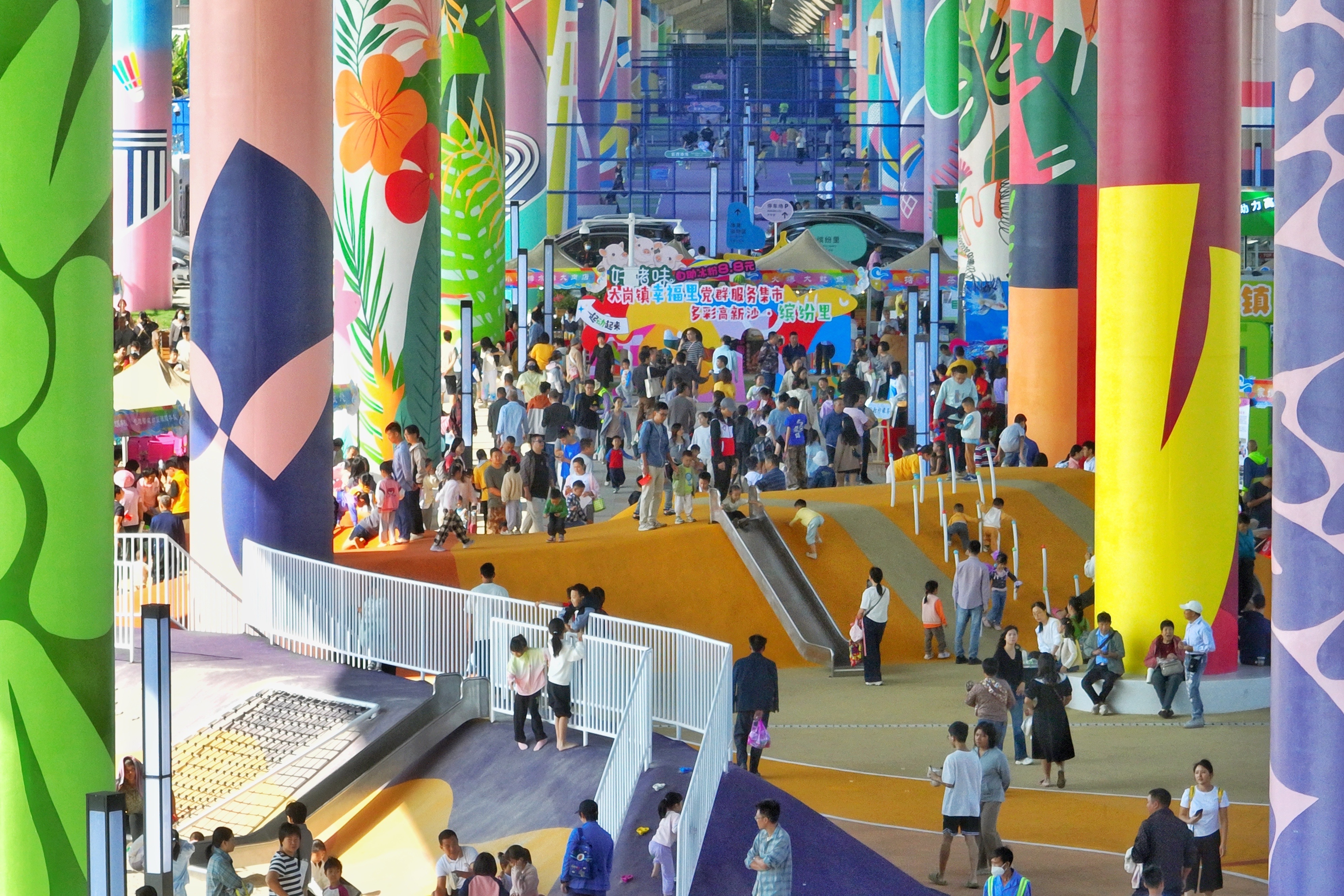 驱车沿黄榄快线穿行至广州市南沙区大岗镇腹地,窗外的景致悄然切换:昔日闲置的桥下空间“变身”错落有致的运动场地,五彩的滑梯、攀爬网等游乐设施点缀其间,成为一个充满童趣与活力的亲子乐园。